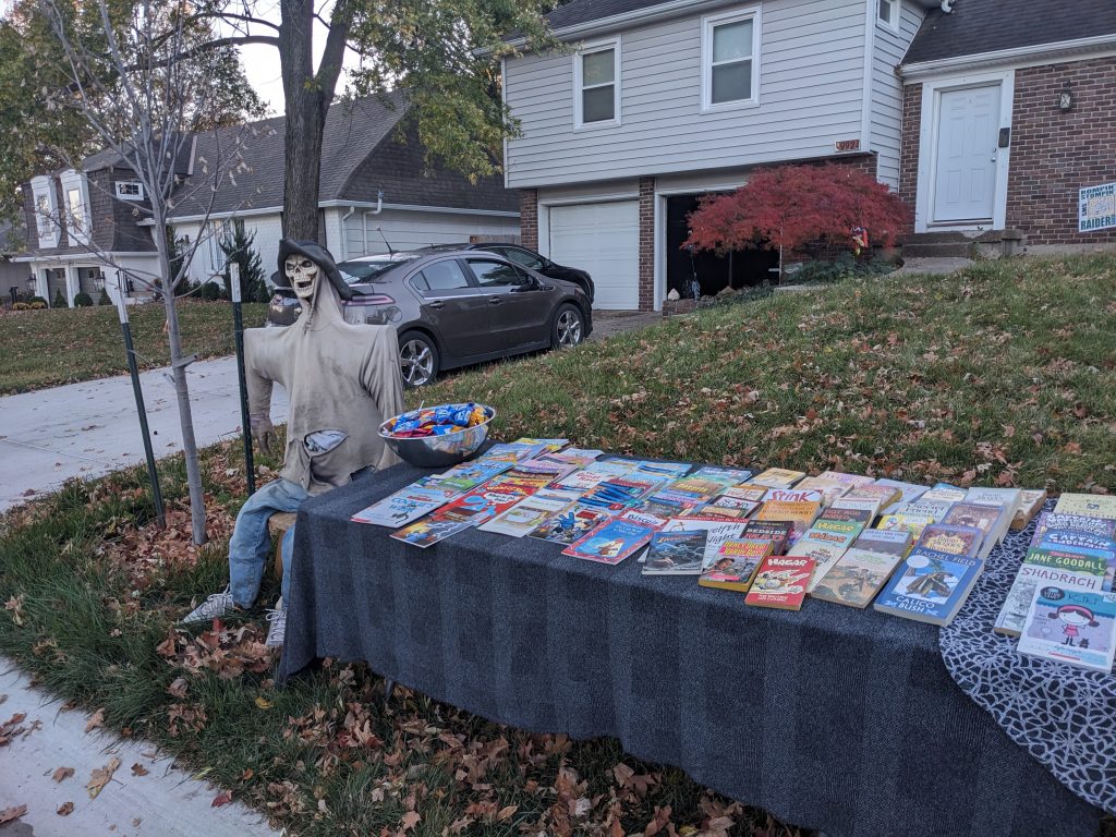 Overall we handed out 102 books to all ages. We did learn that the bigger books just aren’t going to go on Halloween, many an adult looked longingly at “The Dark Elf Trilogy” Collectors Edition and the “Magic of Xanth” omnibus but apparently lugging around a giant hardback and all your kids candy was too much for the average parent. When we get the library up I imagine both will be in circulation quickly.